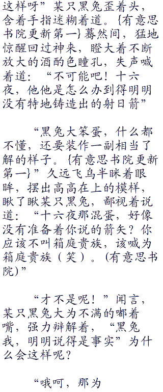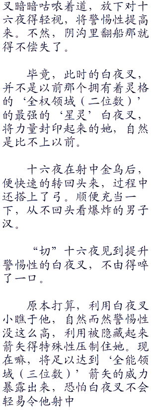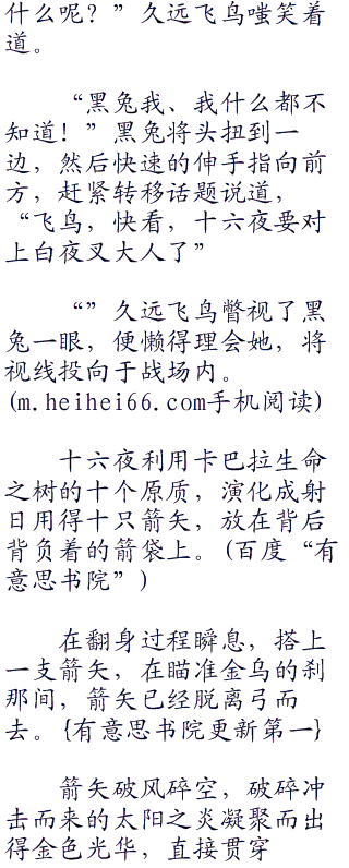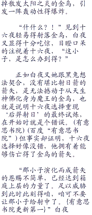 “能够射杀得了金乌的箭矢!”黑兔表情严肃着,睁大着不断收缩的酒酌色瞳孔,郑重得说着。“金乌,在未堕落成肆无忌惮的魔王,开启人类最终试炼之前,乃是箱庭最强的三大种族之一天生神佛。普通的箭矢,还没触及到它们的神躯,便被身体释放出来的太阳之炎化为灰烬。在传说中,人类英雄后羿,为了能够射杀到金乌,是寻找到了世界树,利用世界树的主干铸造成,被后世命名为射日箭的箭矢,从而成功射落太阳。”