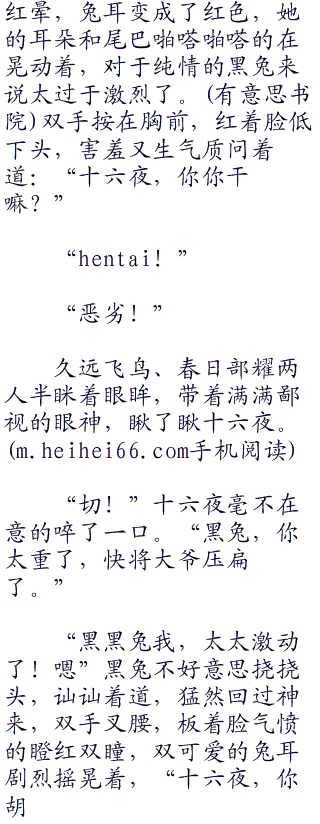 要是化为往常,在享受之余,将某只黑兔粗鲁拉开扔掉。但此刻,十六夜脸上苍白一片,身体内部空空如也,浑身上下仿佛是失去了气力,摇摇欲坠站着,令人有种随时瘫痪倒地的可能。所以说,根本就无半分力量推开黑兔。