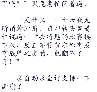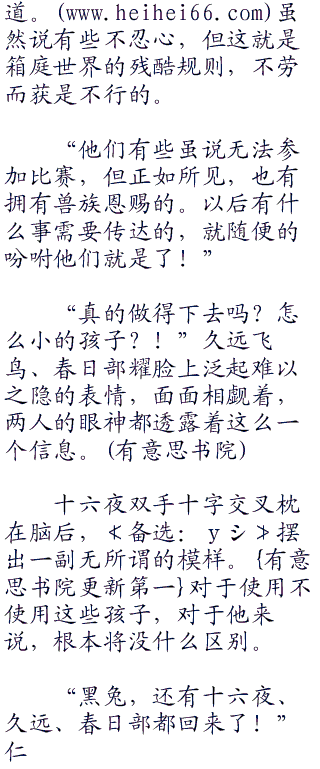 “共同体是在参加者参与恩赐比赛,并得到他们的恩惠才能得以存在。既然生活在箱庭世界,这就是无法回避的规定。而宽容孩子,并不是为了她们的将来好!”黑兔不由分说的气势严肃着