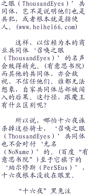 当然,这是典型的睁着眼睛说瞎话。不过,‘召唤之眼(ThousandEyes)’共同体对此,也无话可说。人家剿灭闯入自己共同体总部的盗贼,管你什么事呢?这下,恐怕‘召唤之眼(ThousandEyes)’共同体哑巴吃黄连,有苦自己知。