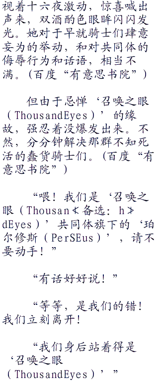 一口咬定,空中‘珀尔修斯(PerSEus)’共同体的骑士们是强盗。如果不是强盗,那为何随便闯入别人共同体总部?而对待强盗的方式,自然是要全部灭掉。至于他们所说的是隶属于‘召唤之眼(ThousandEyes)’共同体旗下成员,这是强盗为了自保而使出得诡计。