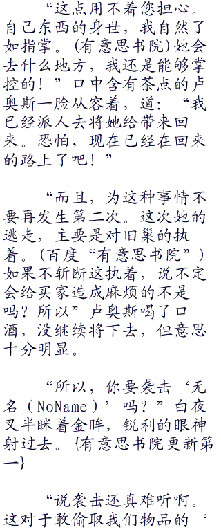 “我知道的哟,那又如何呢?”被称之为卢奥斯的亚麻色男子,亦是‘珀尔修斯(PerSEus)’共同体继承人,喝了口酒,毫不在意轻笑着道。这可是不惜终止恩赐比赛的大交易。只要成功了,就算是离开‘召唤之眼(ThousandEyes)’旗下,寻找新的靠山也没问题。