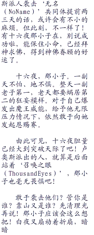 哪怕分为直属和旗下,要不是依然同为‘召唤之眼(ThousandEyes)’共同体成员,而她白夜叉不再是以前那个肆无忌惮最凶残的魔王,早就看不惯秒掉他了,哪留区区的卢奥斯在这此耀武扬威。