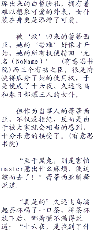 一名身穿配合矮小身高的日式围裙,以狐狸耳朵为特征的少女,推着餐车来到久远飞鸟身旁,从餐桌上将糕点摆在久远飞鸟面前,露出紧张的表情,惶恐僵硬的态度朝着久远飞鸟鞠了个躬,头上狐耳和背后的两条尾巴不断摆动着,道:“请请慢用!”
