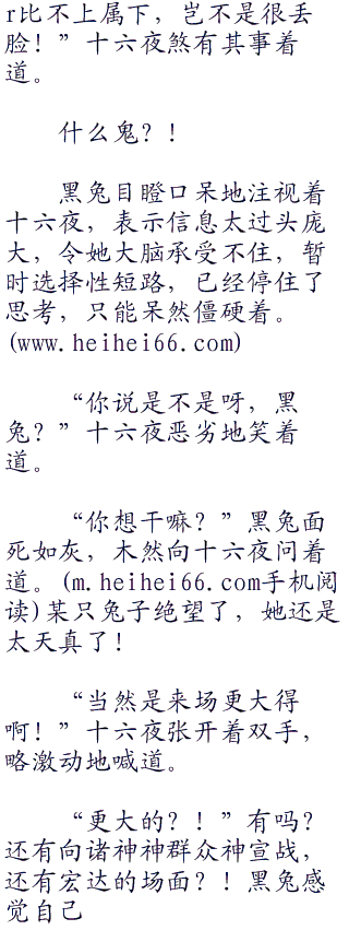 “呃”闻言,黑兔猛地睁大着双眸,情不自禁地向后倒退着。顿时,气势一泻千里,浅红色头发又转化回蓝色,如同是弱鸡般的兔子,瑟瑟发抖地用着惊恐的眼神,注视着自己的天敌。