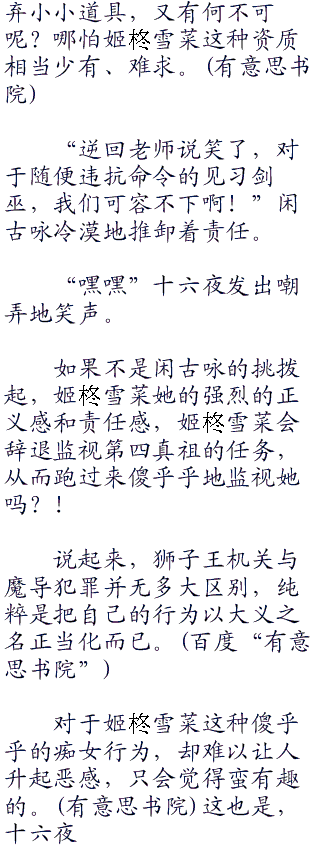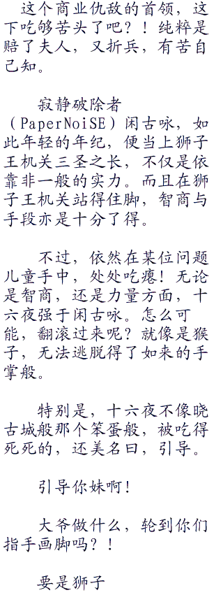 “哼哼”十六夜哼哼着,将放在姬柊雪菜的目光收回,毫不客气地瞪了一眼闲古咏,撇撇嘴、不爽着道:“你们狮子王机关,倒是给大爷添了一丝麻烦啊。”