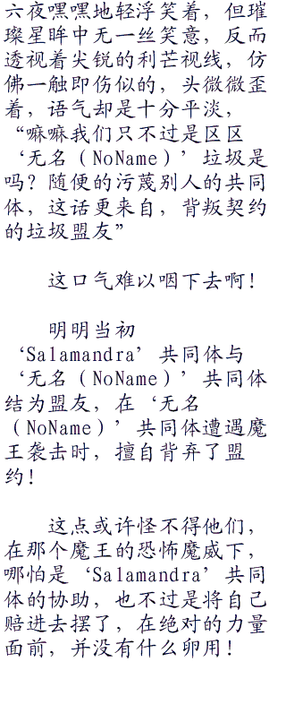 “什么嘛!珊多拉,比起礼节,名誉更重要!他们只不过是区区的‘无名(NoNa)’垃圾而已,如此对待他们将会有损‘Salandra’的威严,我们额”