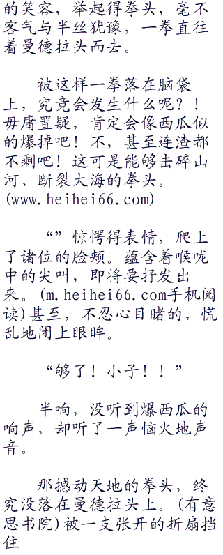 曼德拉恼火着吼着,但还没等他说完,却无法继续说下去了。突如其来的冒出的一只手,紧紧地掐住他的脖子。