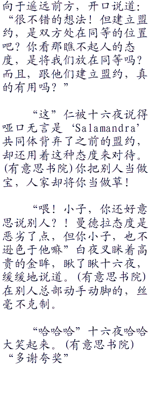 以势压人吗?曼德拉以为用威胁,就能令他乖乖就范。正常情况或许就是这样吧!毕竟嘛,‘Salandra’可是北区的支配者之一,而‘无名(NoNa)’共同体,连旗帜和名号都无法保留的。