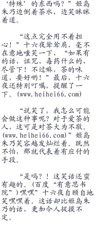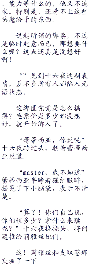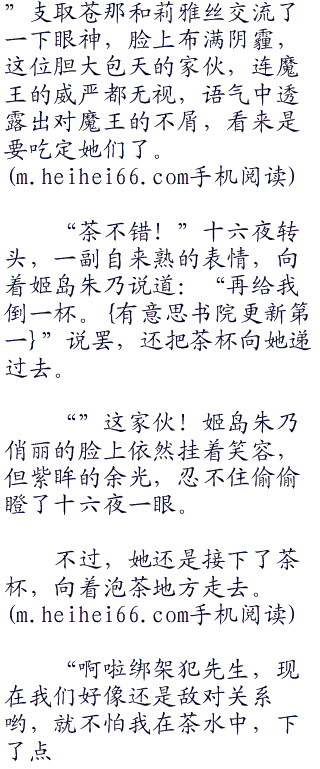 “不就是魔王吗?”十六夜满不在乎地表情,嘴角翘了起来,自信洁白的齿牙亮出,永远是老子第一,老天都得蜗居第二,那般无法无天的狂妄口吻。“他们,有什么资格值得让大爷害怕呢!”