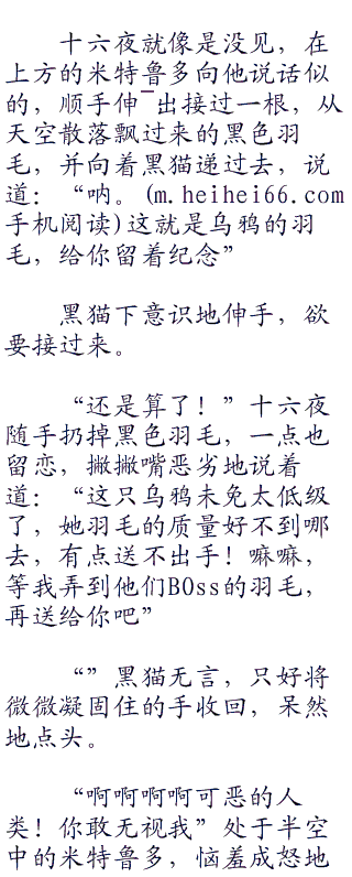 “嘿嘿”点燃了堕天使的怒火,十六夜满不在乎地嘿嘿笑着,一点也不为所动的样子。倒是吓坏了她怀中的黑猫,身躯不断往他身上蹭缩,仿佛是为了找到更多的安全感。对于温暖的怀抱,不再像开始时般害羞抗拒,已经习惯了,被抱着还蛮舒服的。