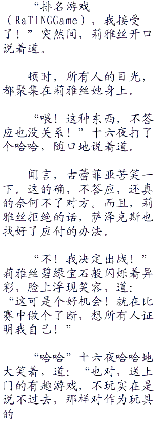 “排名游戏(RaTINGGa)?”莉雅丝面露惊讶之色,睁大着碧绿色宝石般瞳眸,愕然地注视着古蕾菲亚。