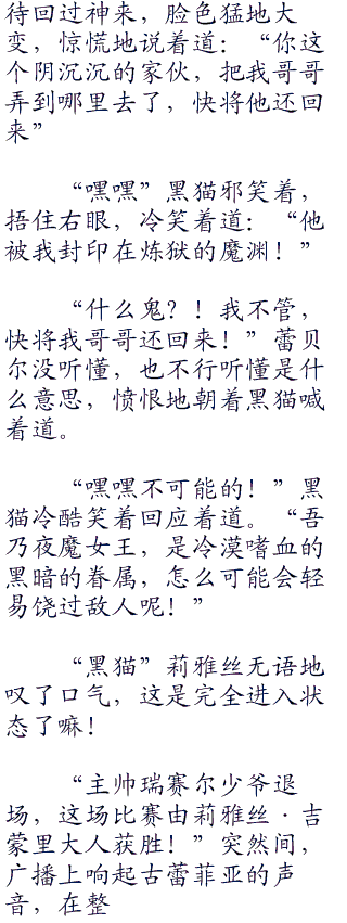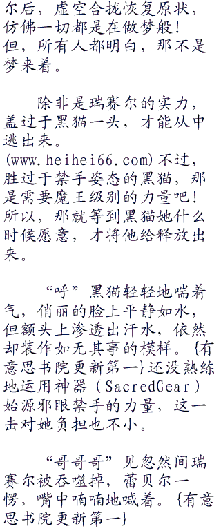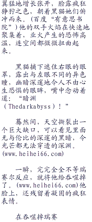 她可知道,这只黑猫觉醒的神器(SacredGear)的时间,是极为短暂。在这么短的时间内,居然令神器(SacredGear)达到了究极领域,这是何等不可思议地事情啊。