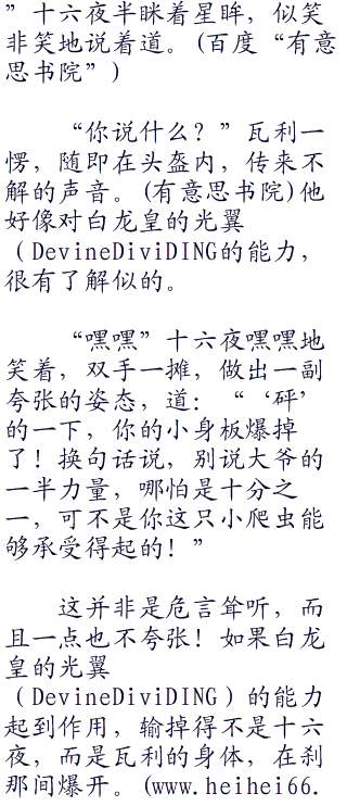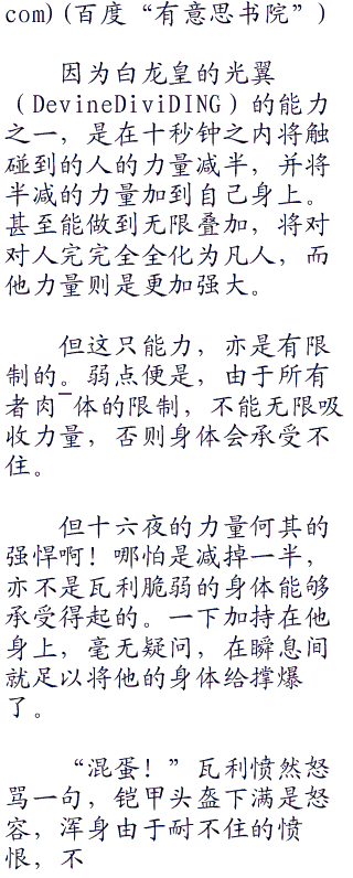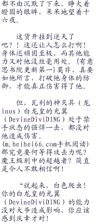 而在场外的阿萨谢尔,面容变得严肃起来。对于瓦利的行为,自然是理解,并非是在耍猴。而是在使用神灭具(龙inus)白龙皇的光翼(DevineDiviDING)的一种能力。