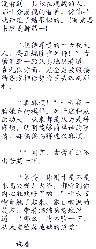 十六夜来到客厅,顿时将在场所有人的目光,集中在他的身上。而他却懒得理会,随意得找了个空余的位置坐下。