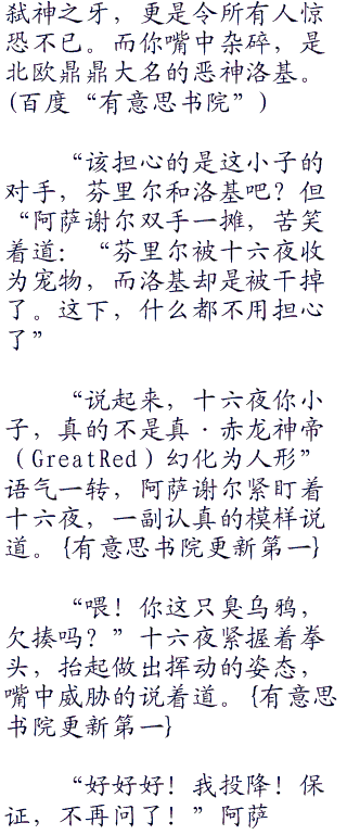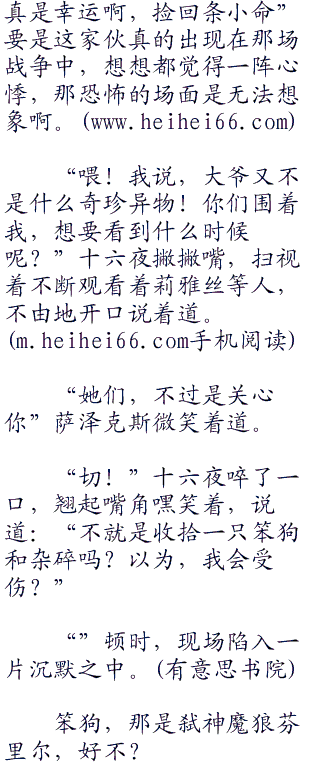 “嘿嘿”十六夜嘿嘿地笑着,危险的目光打量着阿萨谢尔,半眯着转动的星眸,肆无忌惮的笑着道:“要是大爷参与那场战争,会将你这只臭乌鸦给解决掉”