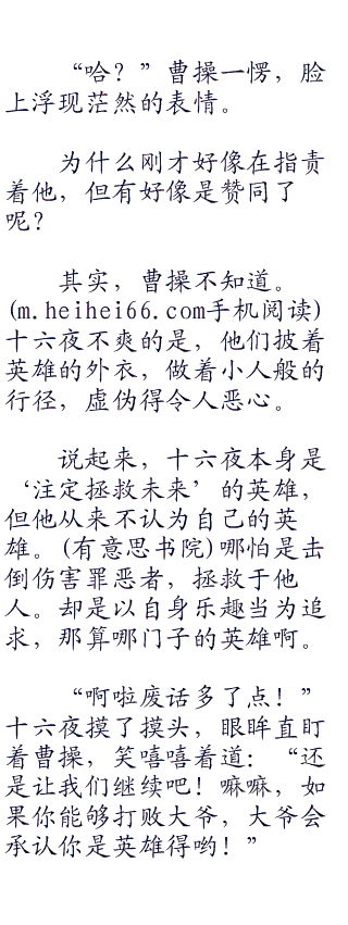“哼哼”十六夜哼哼笑着,歪着头嘲讽地笑道:“你们,不过是名人或者是神话中英雄的后代而已。而且,肆意制造事端搞破坏,这能够称之为英雄了吗?还起名为英雄派,别笑掉人的大牙了!”