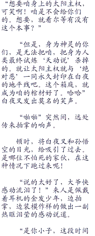 “哼!齐天大圣(与天同齐者),你这败家之犬杀掉咱吗?啊啊啊~,这样,索性抛弃所有立场大闹起来也算是一件趣事。而且,咱也差不多无法忍受那群蠢货,作些令人呕吐的讨厌决策!”
