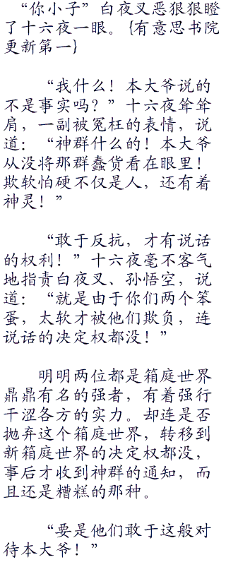 “”孙悟空沉默了许久,脸上阴晴不定的转化着。半晌,仿佛是下定注意似的,坚定地说着道:“白夜叉,你说的不错!”