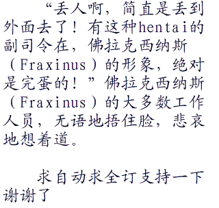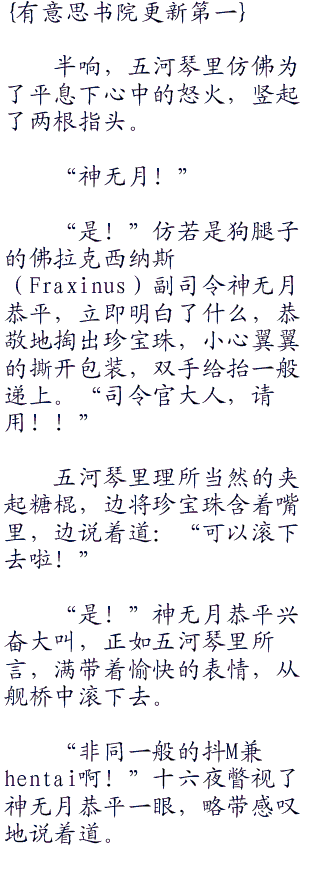 舰长席转过来,显露出司令的真容。披着鲜红的军服,黑色缎带编成两束的赤红头发的少女,栗子一般的圆圆的绯~红双眸,排斥着嘲弄的目光,嘴中含着根珍宝珠牌的棒~棒糖,以居高临下的轻蔑语气开口说着道。