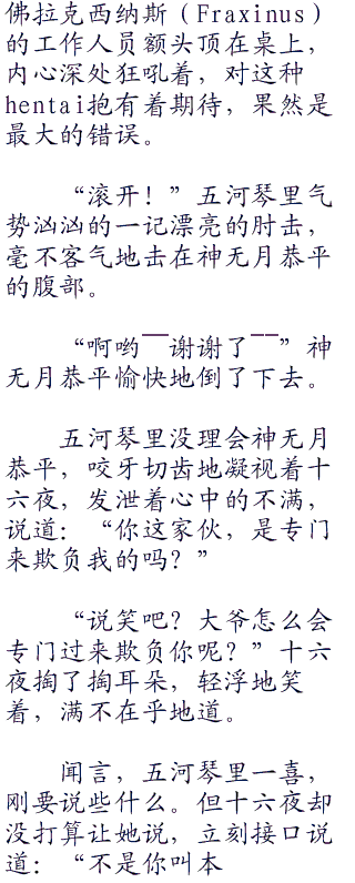 “啊啦”十六夜耸耸肩,满不在乎地说着道:“找不着本大爷,这说明拉塔托斯克(Ratatoskr)的能耐还不够吗?”
