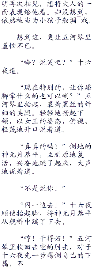 “啊啦,说起来,小琴里这么着急联系我过来,是为什么呢?”说罢,十六夜伸~出舌头,舔了舔干涩的嘴唇,脸上浮现玩味的表情,接着说道:“你可知道,当时本大爷正准备享受大餐。”