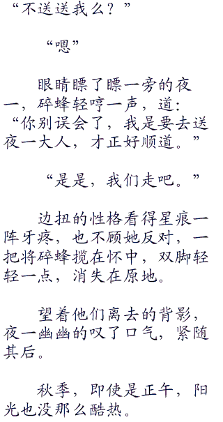 闻言,碎蜂心中没来由一阵烦躁,美目一蹬,哼道:“你就这么急着回去?”话刚说出口才发现自己失言,又加了句。“要走