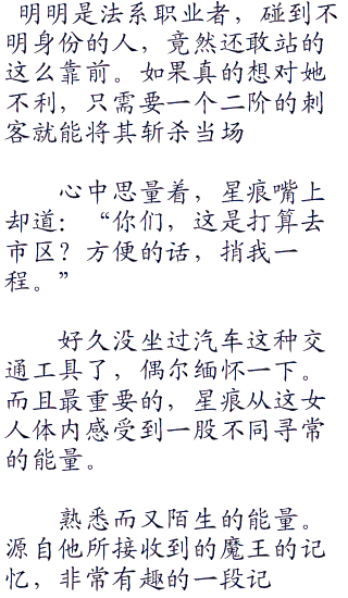 这是一只小型的猎魔团队。其队长,也就是坐在后座上那位留有黑色齐刘海短发,身材玲珑娇小的年轻女人。