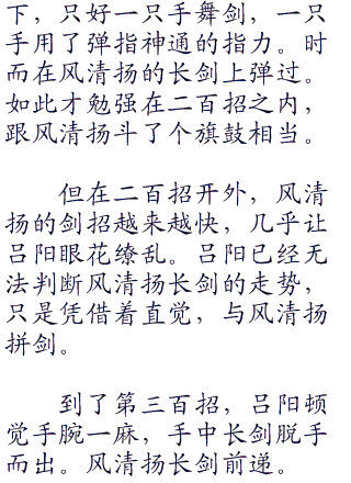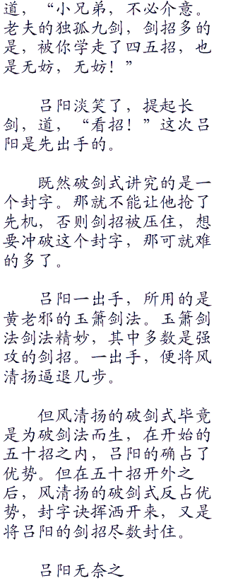 吕阳一见风清扬的剑法略有改变,当即又是转用玉女素心剑法。在风清扬换招的一瞬间,吕阳推出一掌。浩荡的内劲,将风清扬逼退几步。