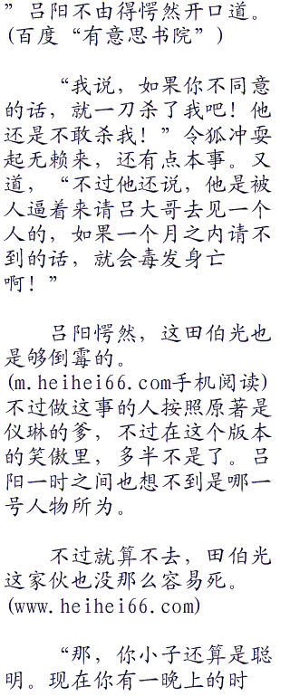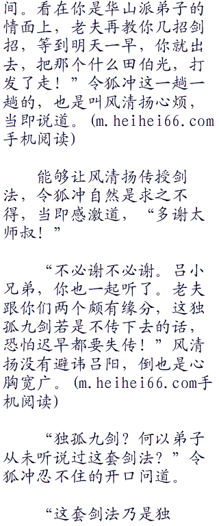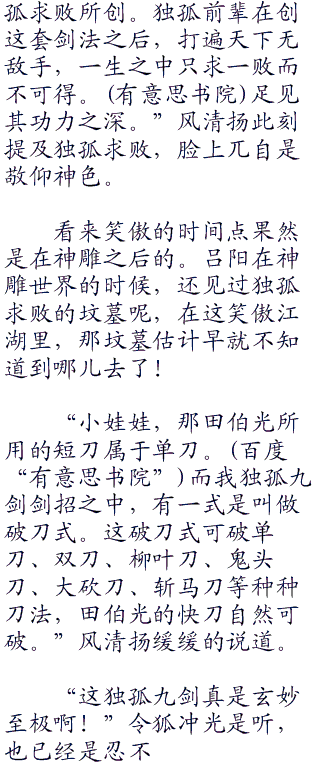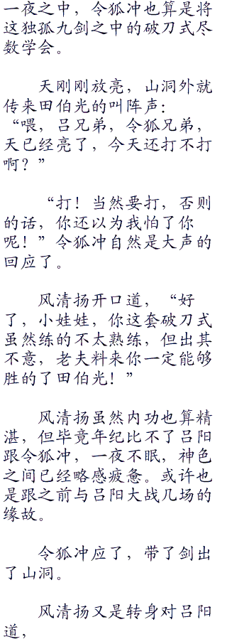 此刻的令狐冲,比方才却还要狼狈许多。右手手臂上被划出了一道口子,鲜血狂流不止。令狐冲一脸无奈的道,“太师叔,你教我的剑法厉害是厉害,就是招数太少,弟子压制田伯光不出三个回合,便被田伯光给破了!”