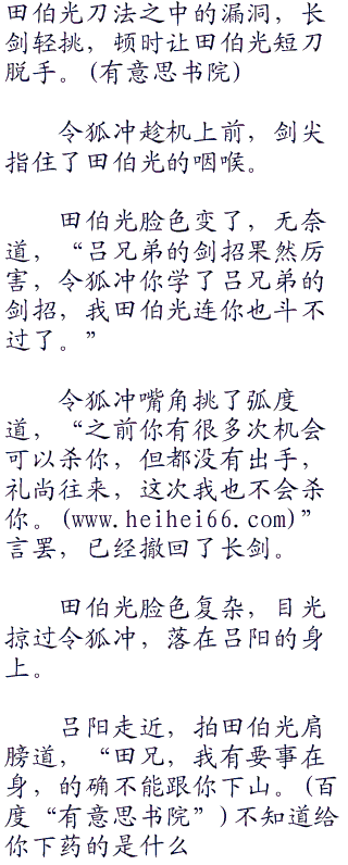 令狐冲跟田伯光转眼之间已经斗了三四百招。田伯光的优势逐渐的转为劣势。终于在四百五十六招的时候,令狐冲挑了