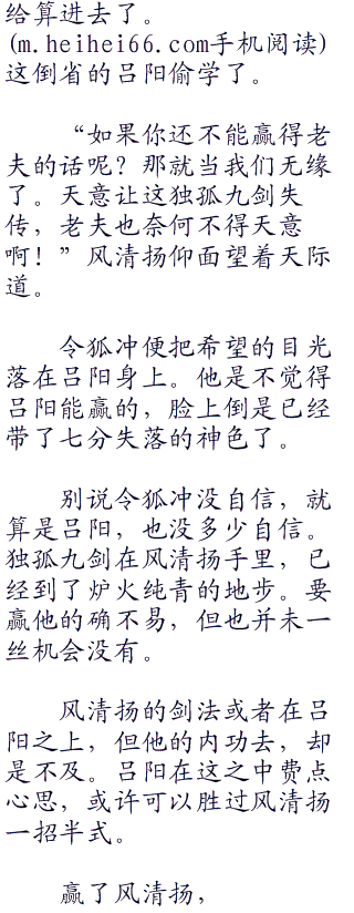 一夜不睡,对内劲充沛而且又年轻的吕阳来说,算不上什么事儿,也没有必要调息。闲着也是闲着,不如出去看看令狐冲跟田伯光的打斗。