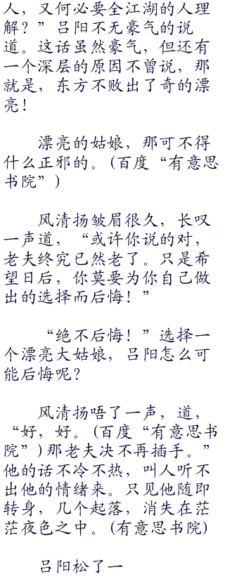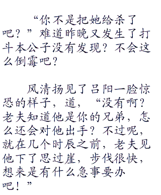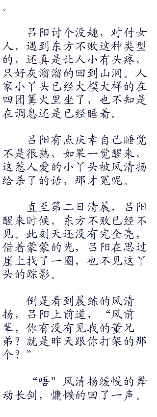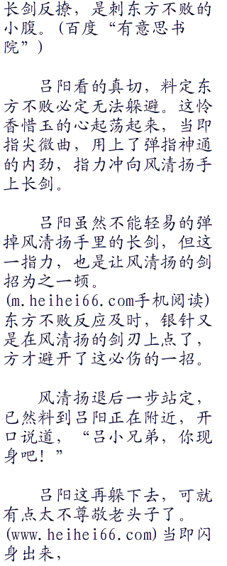 两人在斗到二百八十余招的时候,东方不败招式之中闪出破绽。风清扬自然不能错过,