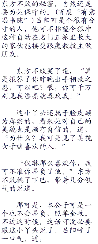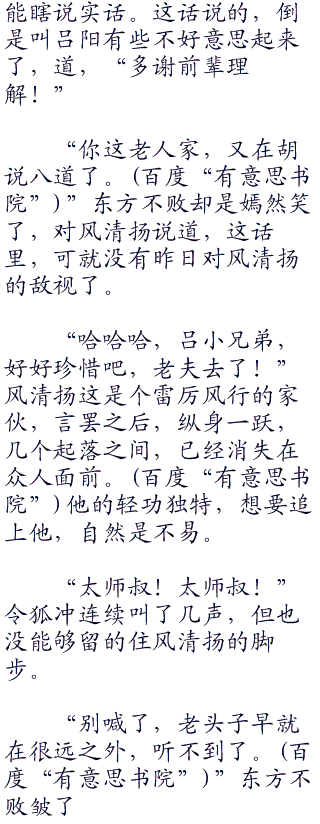 直至令狐冲也从山洞之中出来。风清扬又在独孤九剑上指点了吕阳跟令狐冲,接近中午时间,方才道,“吕小兄弟,令狐小娃,老夫该要走了。”