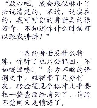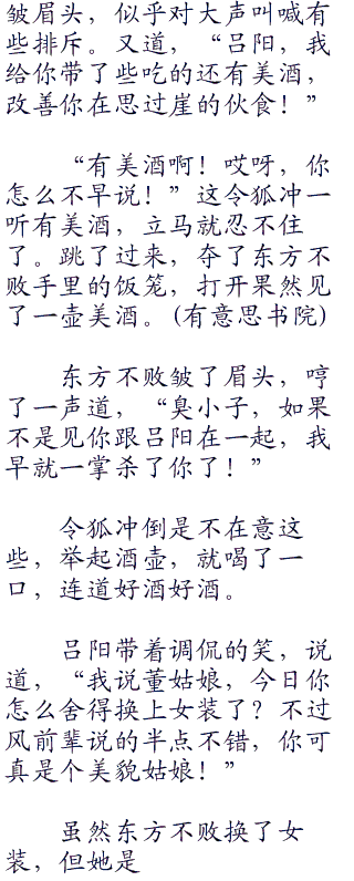 令狐冲没听出风清扬话中深层次的含义,只是道,“哦,原来太师叔住在华山后山啊,那倒方便了。若是太师叔觉得闷了,弟子可以去后山陪太师叔一起喝酒嘛!”