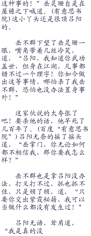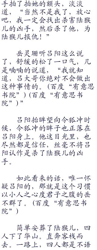“岳掌门,我吕阳的功夫虽然没怎么到家,但也不会稀罕你的紫霞秘籍。还有啊,就算我真的要拿秘籍的话,又何必杀陆猴儿?我又一万种方法可以让他看不到我的脸,何必非杀人?”吕阳还是打算据理力争一下。