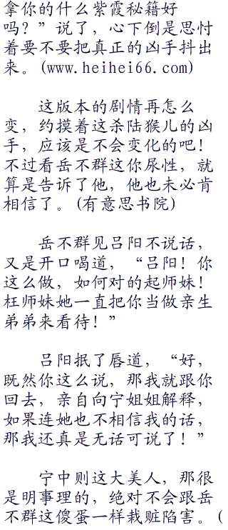 “吕贤弟,如果你觊觎本门的紫霞神功的话,念在你是师妹的弟弟,或许我会传一些给你,你又何必杀人偷秘籍呢!”这岳不群,别的本事不高,冤枉人的本事更是不低。