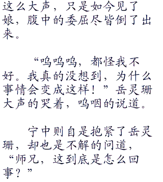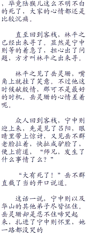 令狐冲跟岳灵珊听了这话,脸色又是大变。岳灵珊倒是摇着头,不肯相信。