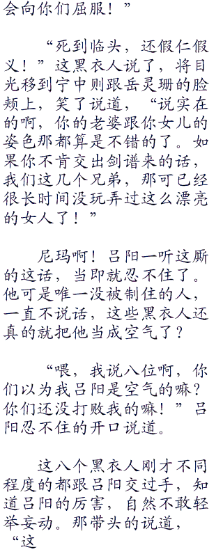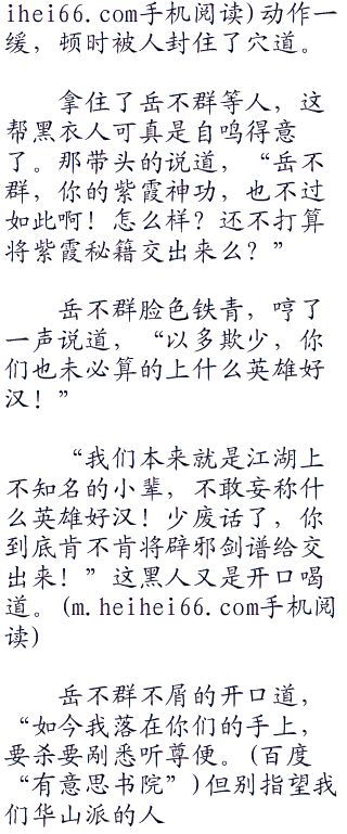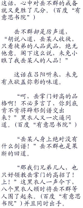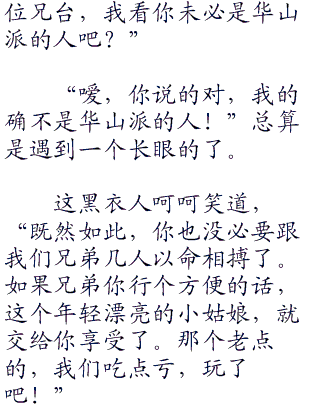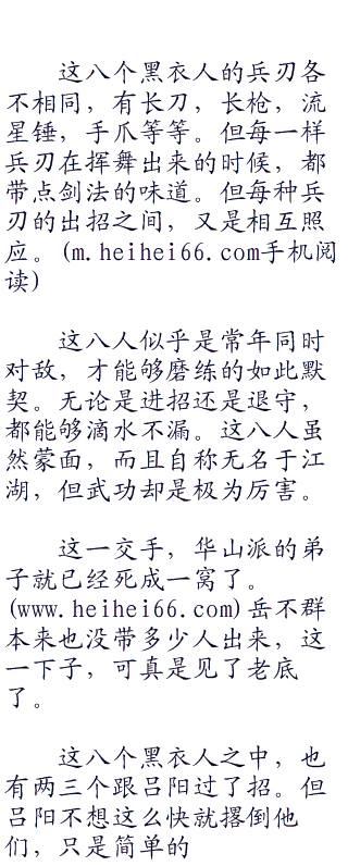 “我们无名无派,只是江湖上无名小卒而已。”其中一个黑衣人开口道,“找岳掌门出来,只想借辟邪剑谱一看!”