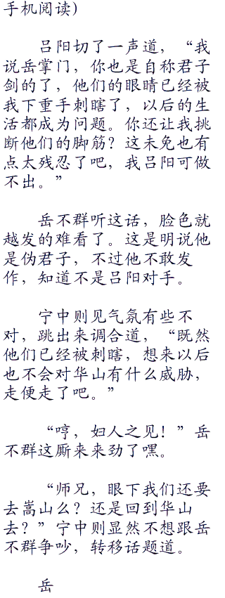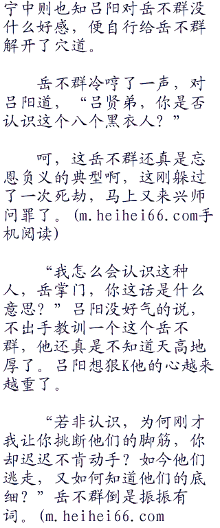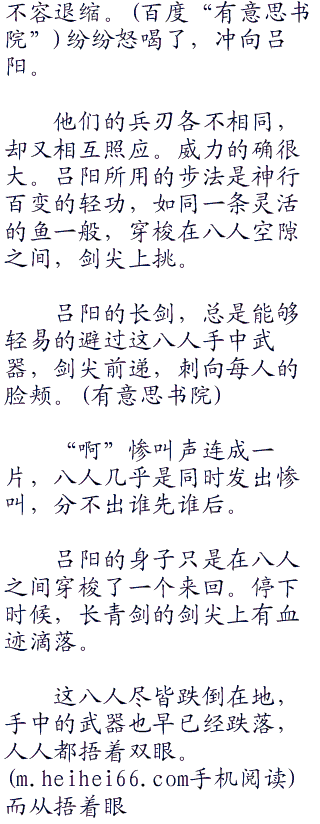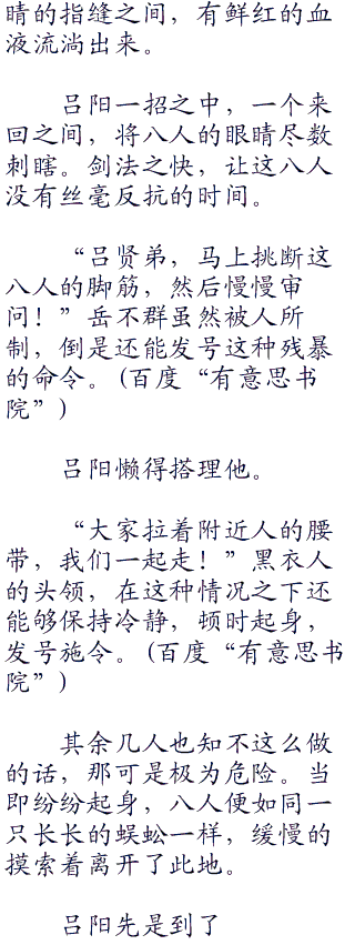 这几个黑衣人都是语塞。不过就这么走的话,丢人可就丢大发了。这带头的那是第一个不忿的,开口道,“小子,你的剑法的确天下无双,但我们八人同时出手,我看你也未必敌得过我们!”