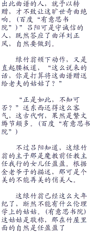 此刻,箫声也戛然而止。片刻之后,绿竹翁从竹屋之中出来,到众人面前,递过曲谱,道,“如今老夫的婆婆已经将曲谱弹奏出来,诸位应该没有疑虑了吧?”