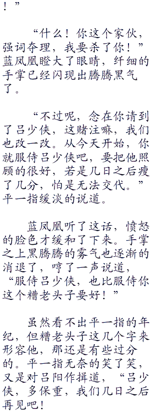 平一指摇了摇头,蓝凤凰却是兴奋的蹦了起来,道,“平一指,你输了,哈哈,我把吕少侠带来了,你还不快叫本姑娘一声奶奶?”