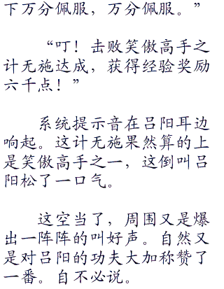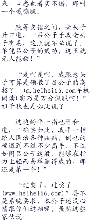 “吕公子好内功啊!”“真是英雄出少年啊!”在短暂的安静之后,又是一片的称赞之声。