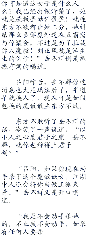 东方不败嫣然笑了说道,“从前有人跟我说,这个天下是男人的天下,女人是做不得主的。从那时候开始,我就一直扮成男装,那一年我十一岁,从此以后,再也没有人知道我的真实性别。除了你。”