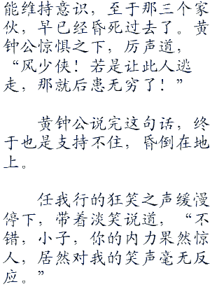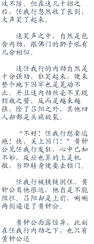 “一招都发不出?哈哈哈,好,好,果然是独孤九剑。你赢了丹青生,秃笔翁,黑白子倒也不奇,但你如何能赢得了黄钟公?他的七弦无形剑,用琴声扰乱内劲,
