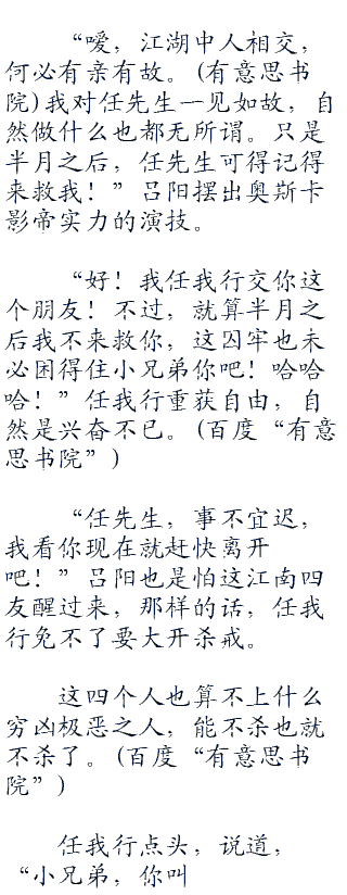 “任先生,这四人很快便会醒转。”吕阳指了地上的江南四友,道,“若是他们醒过来,见任先生不见了,自然会去通知黑木崖。以东方不败之能,会立刻组织人手对付任先生。那任先生岂不没有时间准备?”