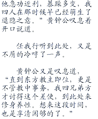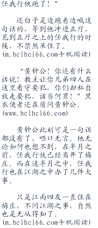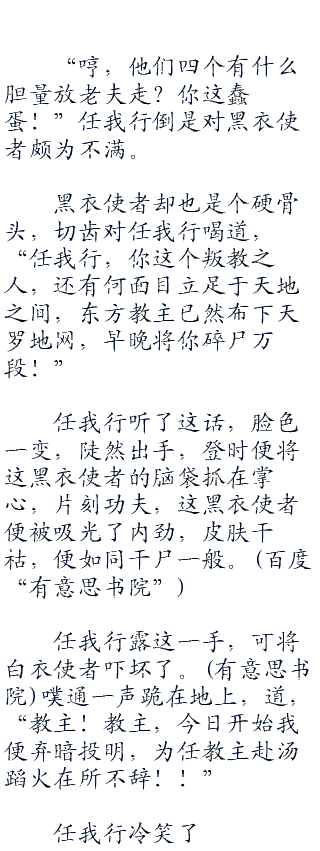黑衣使者冷笑了一声道,“黄钟公,你说着任我行已然被囚禁于此,那好,那就请你带我们两人去见上一见。看看这任我行到底在还是不在!”