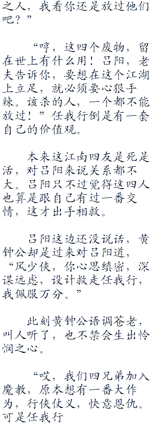 吕阳望过去,见说话的人正是任我行。此刻任我行的左边是任盈盈,右边却是魔教的右使向天问。