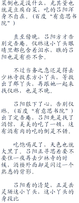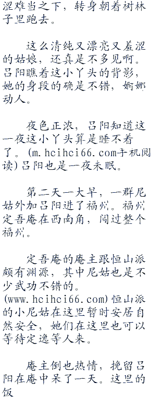 仪琳抿了唇,月光下绝美的脸颊带了几分羞涩,淡淡道,“吕大哥,这一路以来辛苦了,可是明天就可以到福州定吾庵了。”