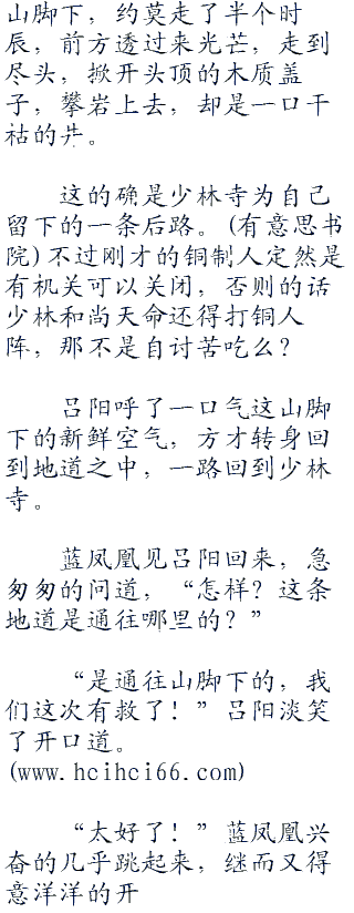 从地道的两侧,同时蹿出铜质人来。这些铜制人乃为机关控制,但从这些铜制人的一招一式之中可以看出,当年布置这些铜制人的人,一定是少林寺内顶尖的高手。